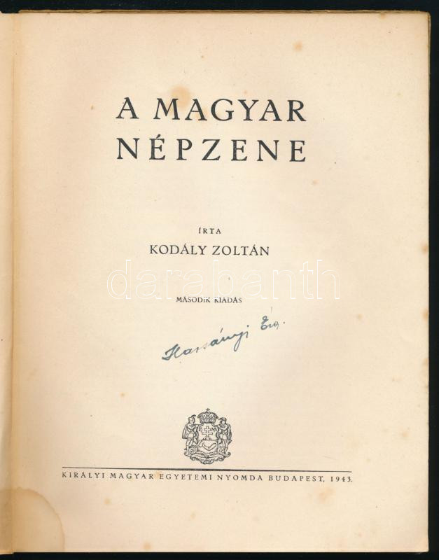 1937 Bartók Béla Kórusművei III. füzet 4. sz: Cipósütés. Bp., 1937, Magyar Kórus Művek, sérült, 3 sztl. lev. + 1943 Kodály Zoltán: A magyar népzene. Bp., 1943, Kir. M. Egyetemi Nyomda, 75+(1) p.+ XII t. Második kiadás. Kiadói papírkötés, kissé foltos, kissé szakadt borítóval, foltos lapokkal, névbejegyzéssel.