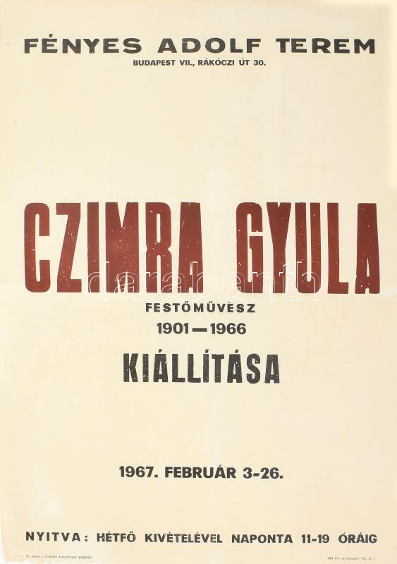1967 Czimra Gyula festőművész 1901-1966 kiállítása, Fényes Adolf Terem, Budapest, plakát, papír, Főv. Nyomdaipari Váll., hajtásnyomokkal, lap alján apró sérülésekkel, 68x49 cm