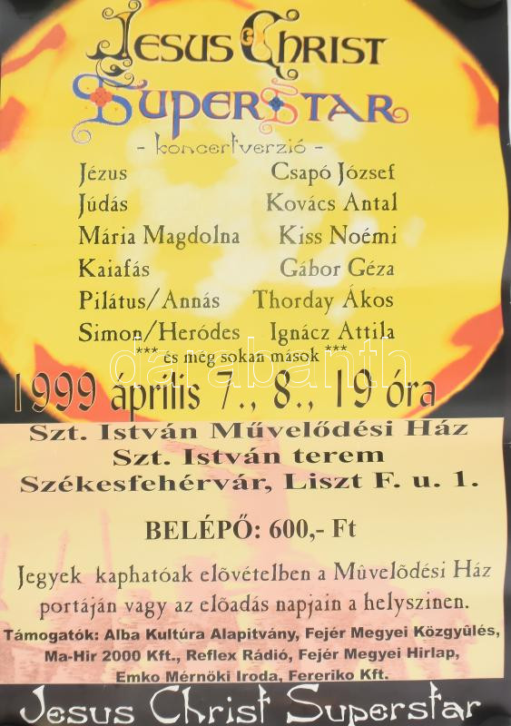 1999 Jézus Krisztus Szupersztár koncert plakát, Székesfehérvár, Szt. I... https://www.darabanth.com/de/488-Fernauktion/488.0/Kunst-Dokumente-andere-Sammelgebiete/Plakat~1000015/1999-Jezus-Krisztus-Szupersztar-koncert-plakat-Szekesfehervar-Szt-Istvan-Muvelodesi-Ha~II3261118