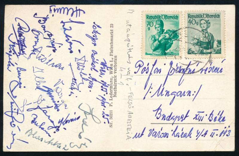 1955. április 25. Magyar utánpótlás válogatott - Felső-Ausztria (4:1) mérkőzésről hazaküldött képeslap, aláírásokkal (Faragó, Mátrai, Dudás, Szabó, Csernai, Ilku, Bencsics, Varga, stb.)
