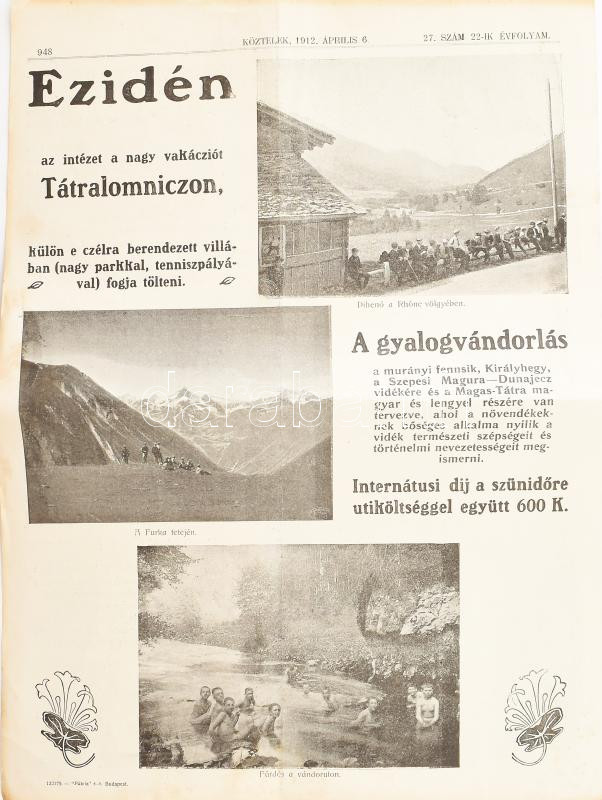 1912 Gábor Ignácz Fiu-Internátusa, Bp., VI. ker, Munkácsy utcza 21 sz., reklám prospektus számos fotó illusztrációval, utolsó oldalon Tátralomnici vakáció hirdetéssel, in: Köztelek, XXII. évf. 27. sz., 1912.IV.8., 945-948. o., hajtva