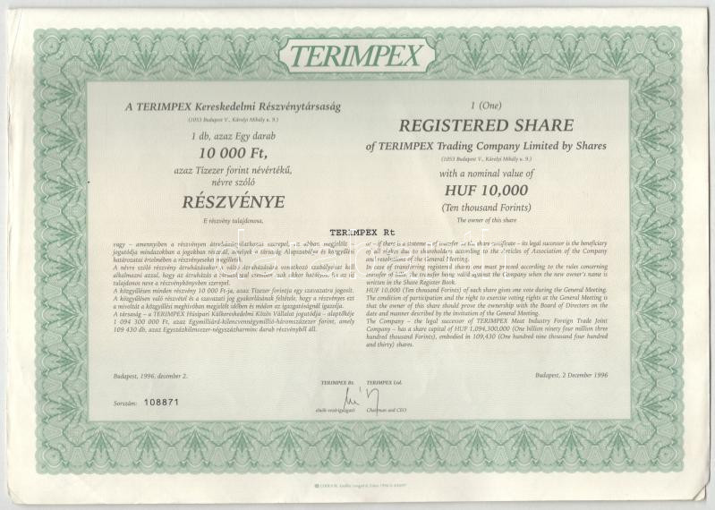 Budapest 1996. "TERIMPEX Kereskedelmi Részvénytársaság" rész... https://www.darabanth.com/de/488-Fernauktion/488.0/Numismatik/Aktien-und-Tickets~500007/Budapest-1996-TERIMPEX-Kereskedelmi-Reszvenytarsasag-reszvenye-10000Ft-rol-5x-sorszamk~II3324764