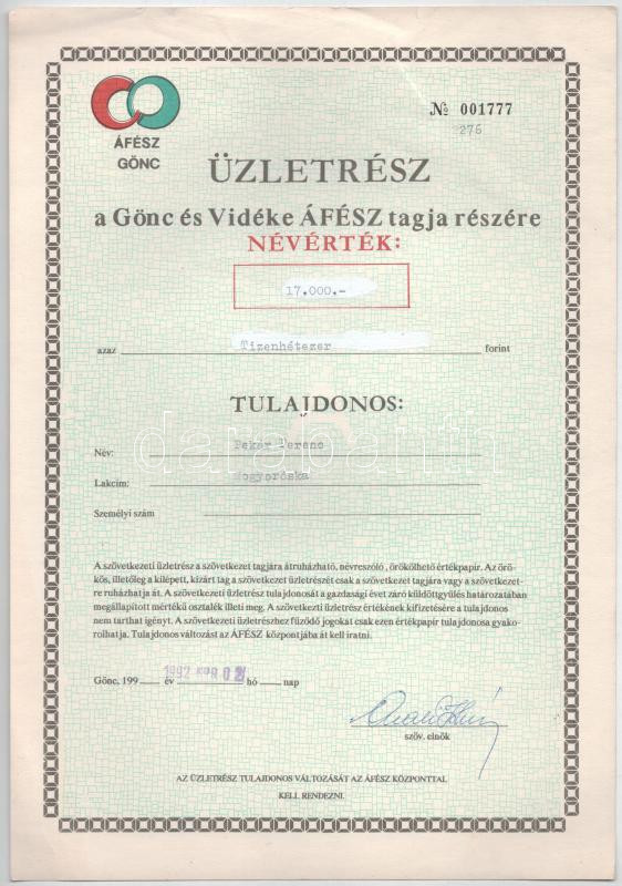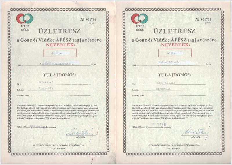 Gönc 1992. "Gönc és Vidéki ÁFÉSZ" üzletrész 5xklf névértékbe... https://www.darabanth.com/de/488-Fernauktion/488.0/Numismatik/Aktien-und-Tickets~500007/Gonc-1992-Gonc-es-Videki-AFESZ-uzletresz-5xklf-nevertekben-TXF~II3313012