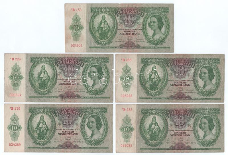 1936. 10P (5x) mind csillagos, különféle sorozatszámmal "*B 158&q... https://www.darabanth.com/de/488-Fernauktion/488.0/Numismatik/Ungarische-Banknoten~500009/1936-10P-5x-mind-csillagos-kulonfele-sorozatszammal-B-158-B-282-kozott-TF-szakad~II3348582