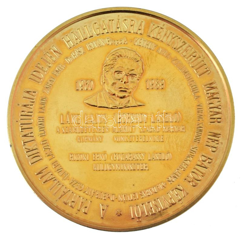 1989. "Hazádnak rendületlenül légy híve, oh magyar! - A mártírok emlékére, akik példát mutattak hazaszeretetből, akik életüket adták a hazáért és a szabadságért / A pártállam diktatúrája idején hallgatásra kényszerült magyar nép bátor képviselői - Láng Lajos (Borsody László) A száműzetésben alakult szabad magya rkormány miniszterelnöke - Rigoni Ernő (Fogarassy László) külügyminiszter" kétoldalas, aranyozott fém emlékérem, sérült tokban (65mm) T:UNC (eredetileg PP)