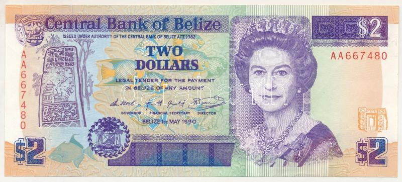 Belize 1990. 2 Dollars C:AU-XF folded corner