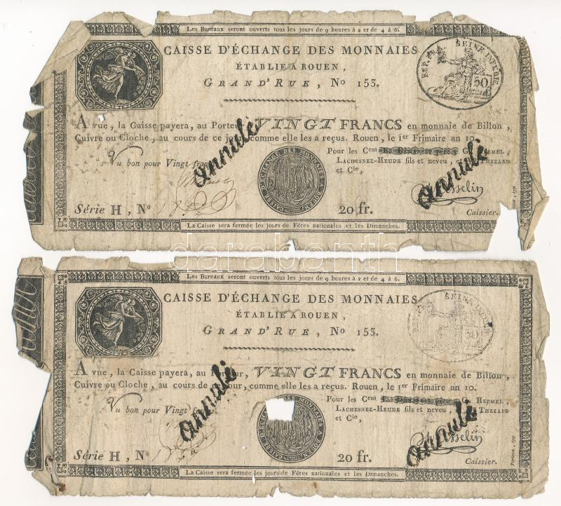 Beschreibung: Franciaország / Rouen 1797-1803. 20Fr "annulé (érvénytelen)" felülbélyegzéssel (2x) T:G France / Rouen 1797-1803. 20 Francs "annulé (cancelled)" (2x) C:G Krause P#S245a