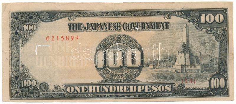 Fülöp-szigetek / Japán megszállás DN(1944) 100P "14 0215899"... https://www.darabanth.com/de/488-Fernauktion/488.0/Numismatik/Weltweit-Banknoten~500015/Fulop-szigetek-Japan-megszallas-DN1944-100P-14-0215899-TF-VG-anyaghiany3Cbr-3E-Philipp~II3343060