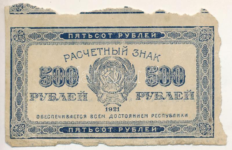 Szovjetunió / Orosz Szocialista Szövetségi Szovjet Köztársaság 1921. 5... https://www.darabanth.com/de/488-Fernauktion/488.0/Numismatik/Weltweit-Banknoten~500015/Szovjetunio-Orosz-Szocialista-Szovetsegi-Szovjet-Koztarsasag-1921-500R-TF-Soviet-Union-R~II3312007