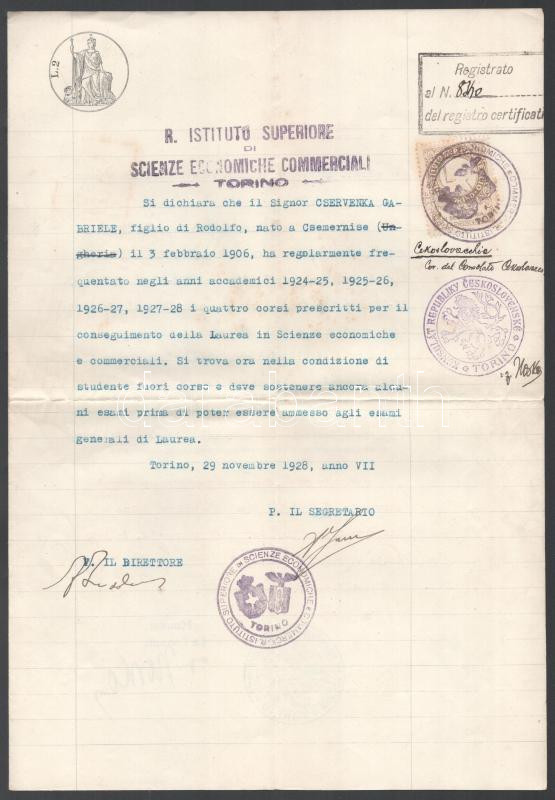 1928 Torino olasz iskolai bizonyílvány 2L szignettával és torinoi ille... https://www.darabanth.com/de/488-Fernauktion/488.0/Philatelie-und-Postgeschichte-Ungarn/Stempelmarken~21/1928-Torino-olasz-iskolai-bizonyilvany-2L-szignettaval-es-torinoi-illetekbelyeggel~II3215035