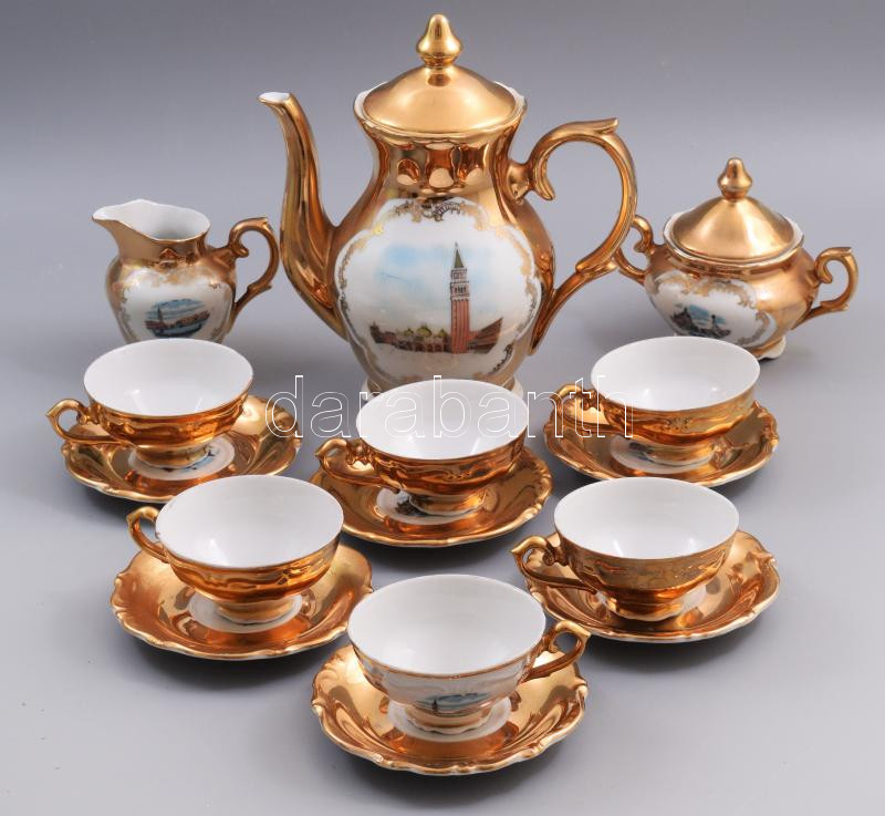 Beschreibung: Bavaria vastagon aranyozott kávés készlet, olasz városképekkel díszítve, jelzett, kopott, teljes.