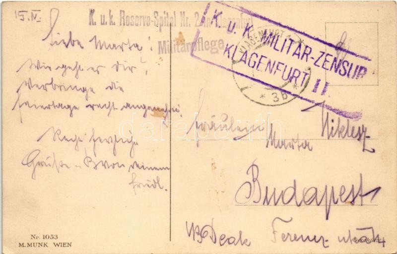 Beschreibung: Herzliche Ostergrüsse! / Easter greeting art postcard. M. Munk Wien Nr. 1053. + "K.u.K. Reserve-Spital Nr. 2. in Klagenfurt Militärpflege" (EK)