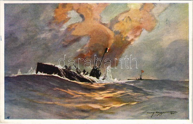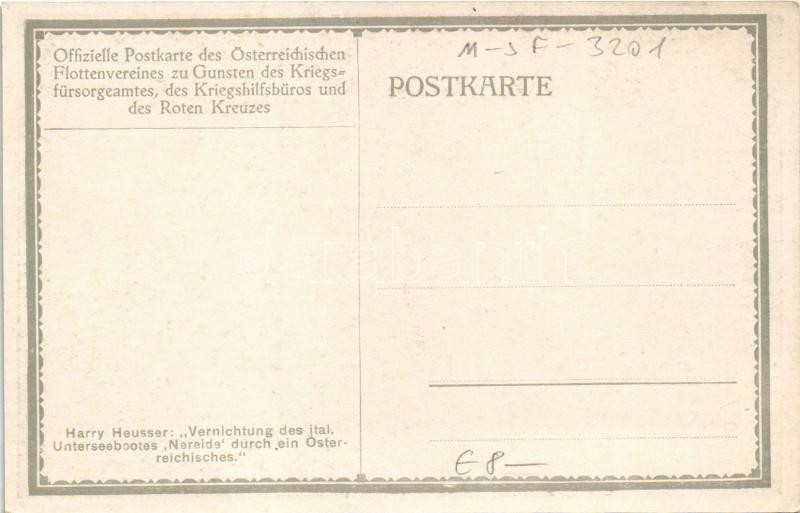 Vernichtung des ital. Unterseebootes "Nereide" durch ein Österreichisches. Offizielle Postkarte des Österreichischen Flottenvereines zu Gunsten des Kriegsfürsorgeamtes, des Kriegshilfsbüros und des Roten Kreuzes - K.u.k. Keriegsmarine / WWI Austro-Hungarian Navy art postcard, sinking of the Italian "Nereide" submarine s: Harry Heusser