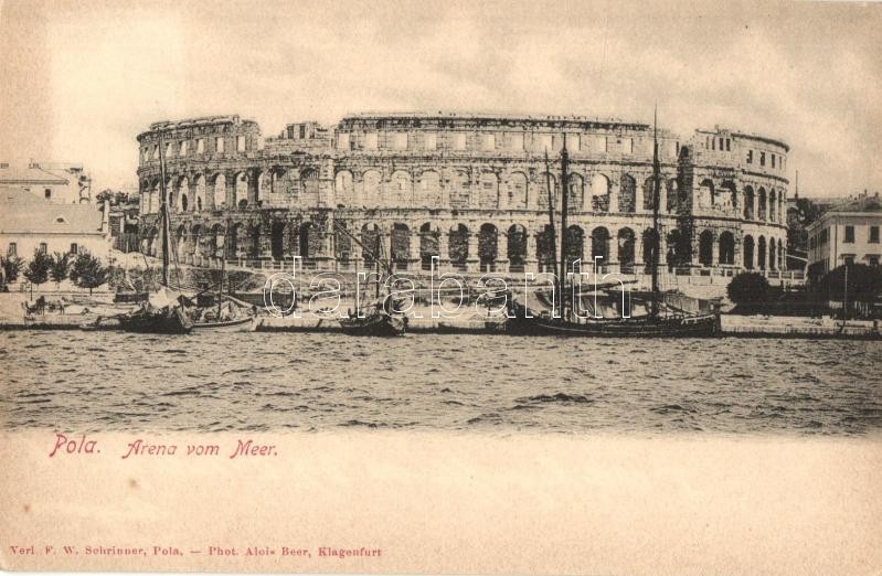Pola, Arena, ships, F. W. Schrinner https://www.darabanth.com/de/489-Fernauktion/489.0/Ansichtskarten/Kroatien~1500009/Pola-Arena-ships-F-W-Schrinner~II1885834