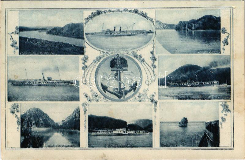 1939 A Magyar Királyi Folyam- és Tengerhajózási Rt. mozaiklapja, gőzhajó, horgony, címer, "AUGUSZTA" hajó. Klösz György és Fia kiadása / Hungarian shipping, multi-view postcard. floral (fl)