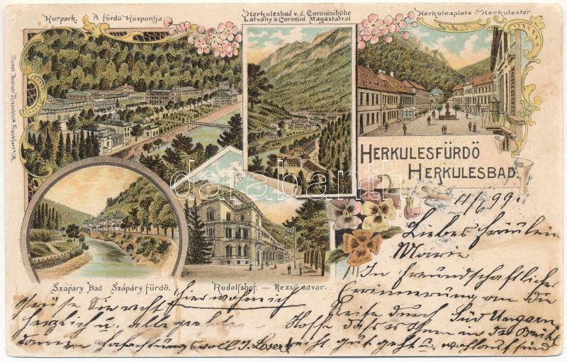 1899 (Vorläufer) Herkulesfürdő, Baile Herculane; Kurpark, Herkulesbad v. d. Coroninihöhe, Herkulesplatz, Szapáry-Bad, Rudolfshof / A fürdő központja, látvány a Coronini-magaslatról, Herkules tér, Szapáry fürdő, Rezső udvar / spa, general view, square, bath. Kunstanstalt Rosenblatt Art Nouveau, floral, litho (Rb)