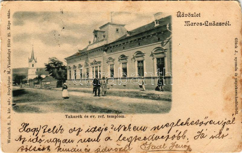 1903 Marosludas, Ludosul de Mures, Ludus; Takarékpénztár, Református templom. Glück J. kiadása, Weinrich S. b. kir. udvari fényképész fényképe után / savings bank, Calvinist church (EM)