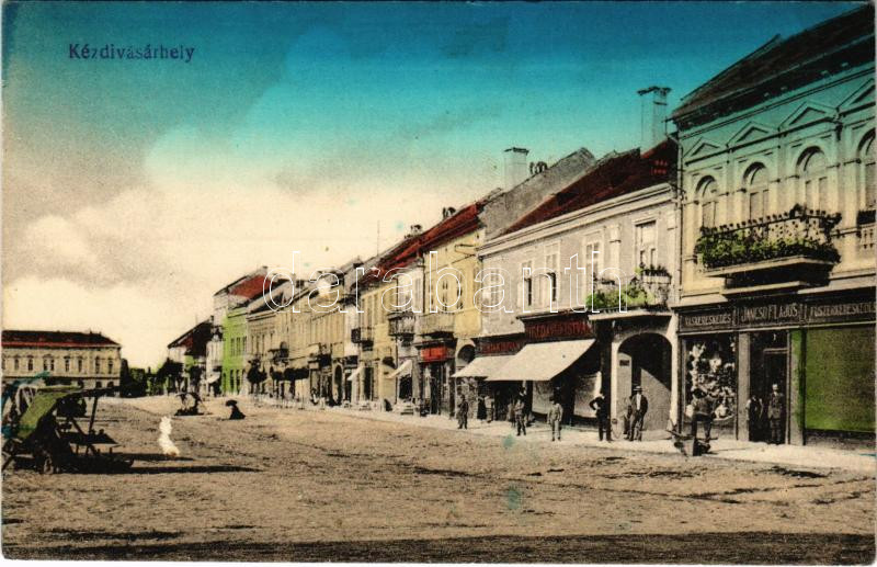 Beschreibung: Kézdivásárhely, Targu Secuiesc; tér, Jancsó F. Lajos, Ifj. Dávid István, Wertán István üzlete, piac. Turóczi István kiadása / square, shops, market (Rb)