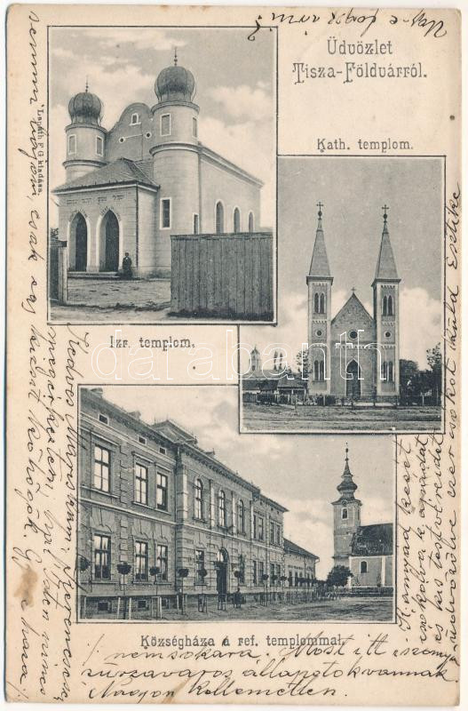 Beschreibung: 1905 Tiszaföldvár, római katolikus templom, izraelita templom, zsinagóga, községháza a református templommal. Lapáth F. G. kiadása (fl)