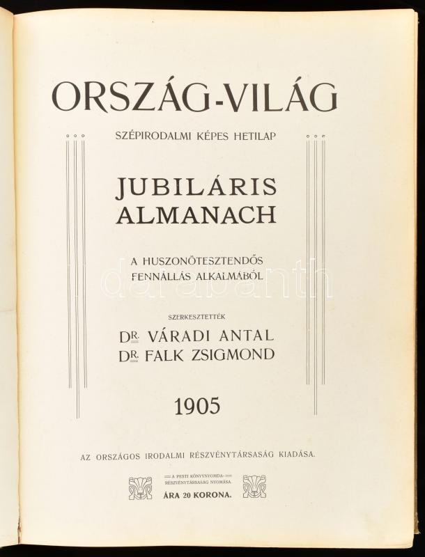 1905 Ország Világ. Szépirodalmi képes hetilap. Jubiláris almanach. Sze... https://www.darabanth.com/de/489-Fernauktion/489.0/Bucher/Bucher-Andere-kuriositaten~2000028/1905-Orszag-Vilag-Szepirodalmi-kepes-hetilap-Jubilaris-almanach-Szerk-Varadi-Antal-Falk-~II3050896