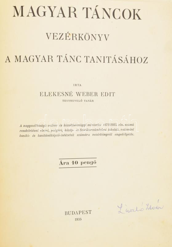 Elekesné Weber Edit: Magyar táncok. Vezérkönyv a magyar tánc tanításához. Bp., 1935, Szerzői kiadás,(Stephaneum-ny.,)230+2+LXIV+4 p. Fekete-fehér fotókkal, szövegközti ábrákkal, kottákkal. Átkötött egészvászon kötés, az eredeti borító belekötve.