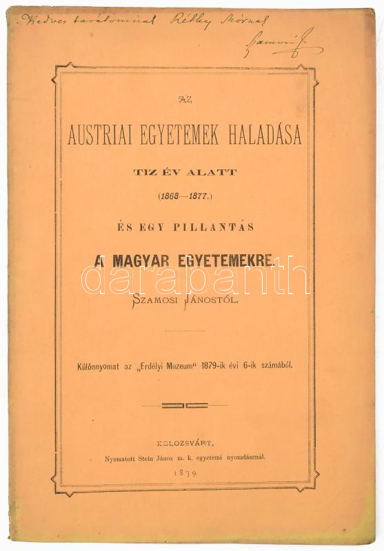 Szamosi János: Az austriai egyetemek haladása tíz év alatt. (1868-1877) és egy pillantás a magyar egyetemekre. A szerző, Szamosi János (1840-1909) bölcseleti doktor, egyetemi tanár, által Réthy Mór (1846-1925) matematikus, fizikus részére DEDIKÁLT példány. Kolozsvár, 1879, Stein János, 31 p. Különlenyomat. Kiadói papírkötés. Felvágatlan példány!