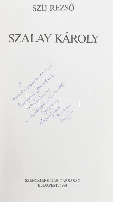 Szíj Rezső: Szalay Károly. A szerző, Szíj Rezső (1915-2006) művelődés- és irodalomtörténész, művészeti író által Molnár József (1918-2009) emigráns magyar író, könyvkiadó, nyomdász, a (Új) Látóhatár folyóirat és az Aurora Kiadó szerkesztője részére DEDIKÁLT példány. Bp., 1991, Szenczi Molnár Társaság. Kiadói papírkötés.