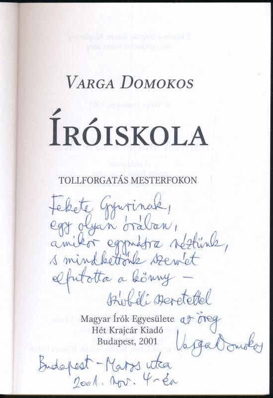 Varga Domokos: Íróiskola. A szerző, Varga Domokos (1922-2002) Kossuth-díjas író, újságíró által DEDIKÁLT! Bp., 2001, Hét Krajcár. 207 p. Kiadói papírkötés.