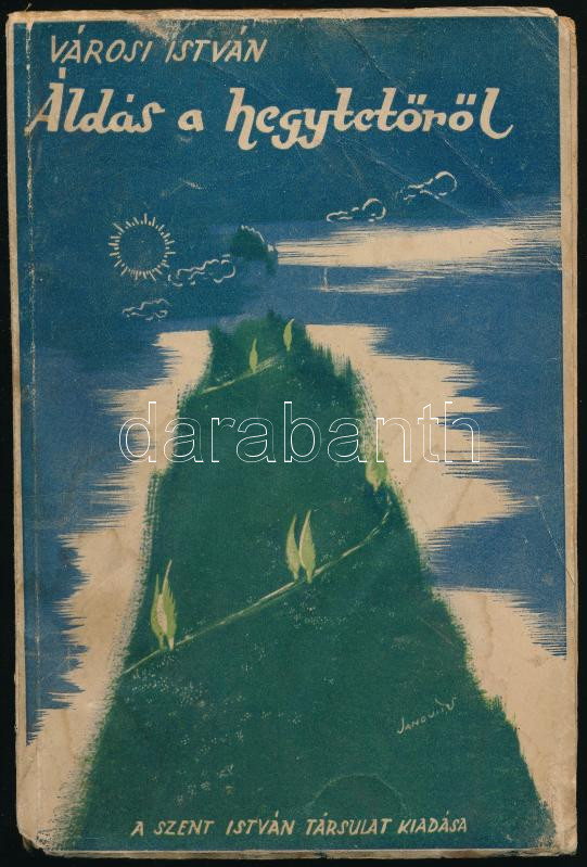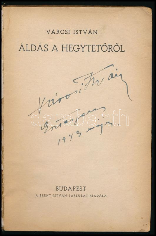 Városi István: Áldás a hegytetőről. (Aláírt!) Bp., 1942, Szent István-Társulat, 202+(2) p. A borító Janovits István munkája. Kiadói papírkötés, kissé sérült, a borítón ázásnyomokkal, néhány lapon lapszéli foltokkal, sérüléssel. A szerző, Városi István (1905-1978) esztergomi kanonok, tanár, író, költő által aláírt példány.