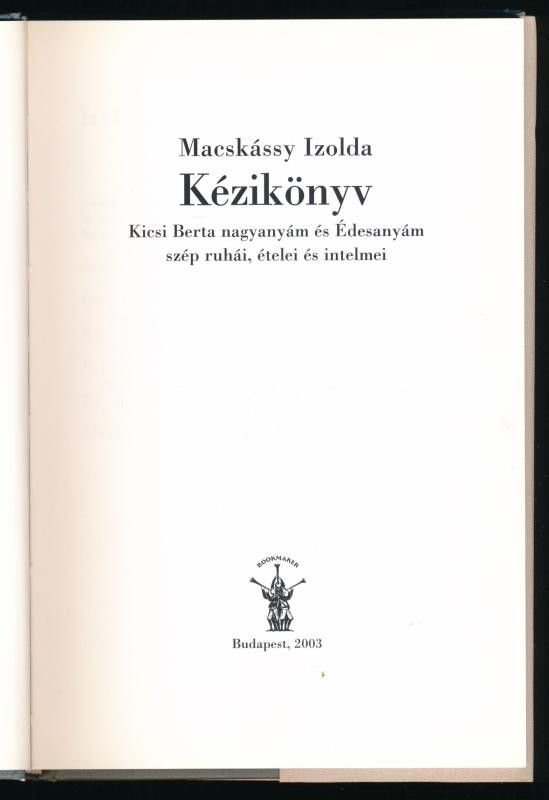 Macskássy Izolda: Kézikönyv. Kicsi Berta nagyanyám és Édesanyám szép ruhái, ételei és intelmei. Jancsó Miklós filmrendező bevezetőjével. Bp., 2003, Bookmaker, 71+(1) p. Harmadik kiadás. Kiadói kartonált papírkötés, kiadói papír védőborítóban.