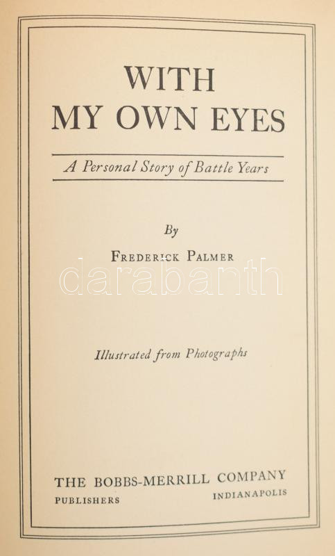 Frederick Palmer: With my own eyes. A personal story of battle years. Indianapolis,1933.,The Bobbs-Merrill Co. Angol nyelven. Fekete-fehér fotókkal illusztrált. Kiadói félvászon-kötés, kopott borítóval, a gerinc felső részén kis sérüléssel.