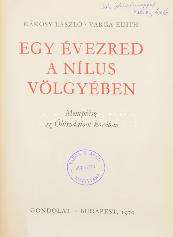 Kákosy László - Varga Edith: Egy évezred a Nílus völgyében. Memphisz az Óbirodalom korában. A szerző, Kákosy László (1932-2003) által DEDIKÁLT példány! Bp., 1970, Gondolat, 287+1 p.+97 (fekete-fehér képtáblák) t. Fekete-fehér fotókkal illusztrált. Kiadói egészvászon-kötés, kopott kiadói papír védőborítóban, ex libris bélyegzéssel.