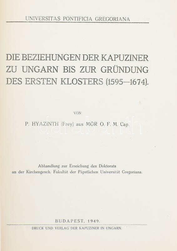 [Frey Jácint (1914-1983)] P. Hyazinth [Frey] aus Mór O. F. M. Cap.: Die Beziehungen der kapuziner zu Ungarn bis zur Gründung des ersten Klosters 1595-1674. A szerző, Frey Jácint (1914-1983) által Vigassy Mihály (1947-2020) katolikus pap részére DEDIKÁLT példány! [Universitas Pontifica Gregoriana.] Bp., 1949, Der Kapuziner in Ungarn, [Kapucinus-ny.], XVI+248 p.+1 t. Német nyelven. Félvászon-kötésben, jó állapotban.