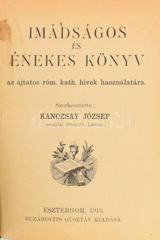 Kanozsay József: Imádságos és énekes könyv. Szerk.: - -. Esztergom, 1913, Buzárovits Gusztáv. Korabeli félvászon-kötés, kissé kopott borítóval.