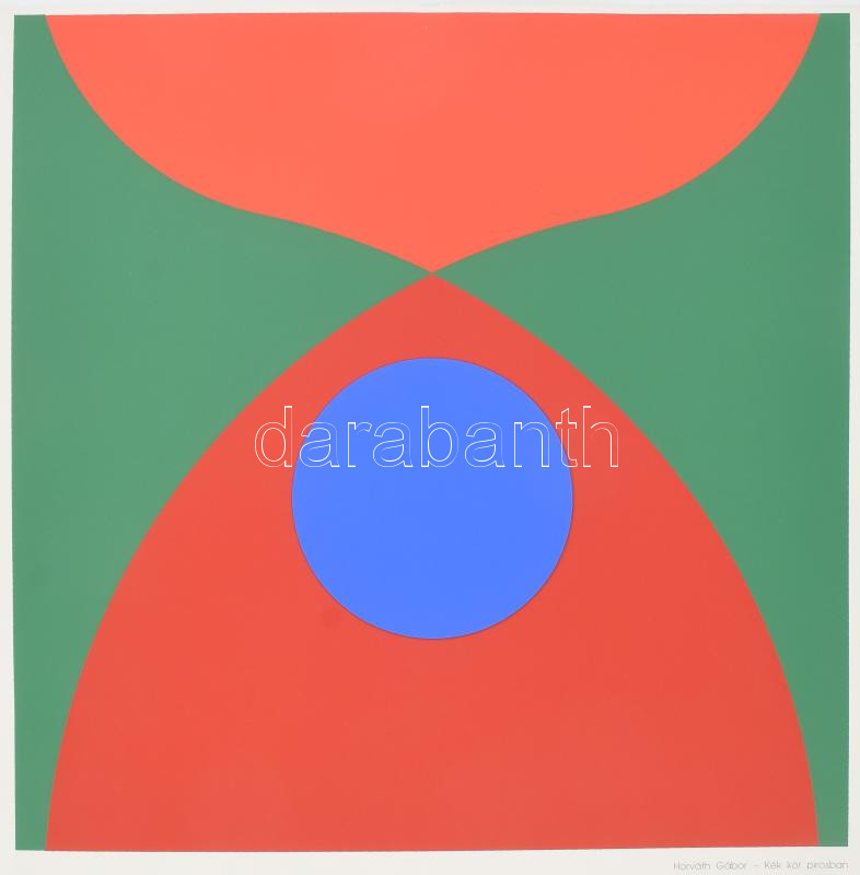 Beschreibung: Horváth Gábor (-): Kék kör pirosban. Szitanyomat, papír, jelzett a nyomaton, 31x31 cm