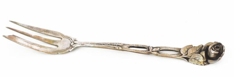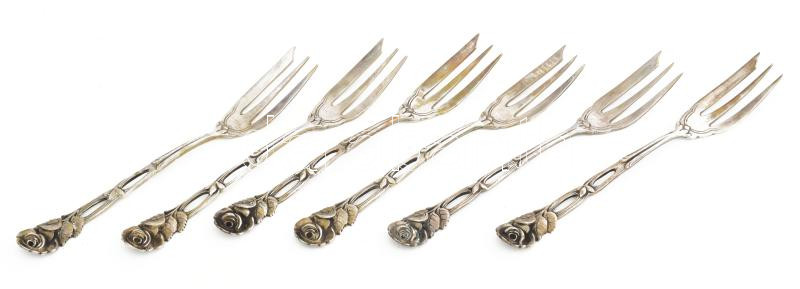 Beschreibung: Ezüst (Ag) 6 db rózsás nyelű desszertes villa készlet, jelzett, h: 13,4 cm, nettó 96 g