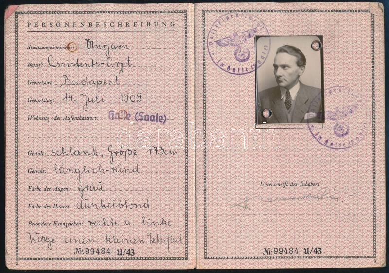 1943 Német Birodalom, magyar orvos részére kiállított ideiglenes fényk... https://www.darabanth.com/de/489-Fernauktion/489.0/Kunst-Dokumente-andere-Sammelgebiete/Dokument~2000029/1943-Nemet-Birodalom-magyar-orvos-reszere-kiallitott-ideiglenes-fenykepes-igazolvany-vorlC3~II3249486