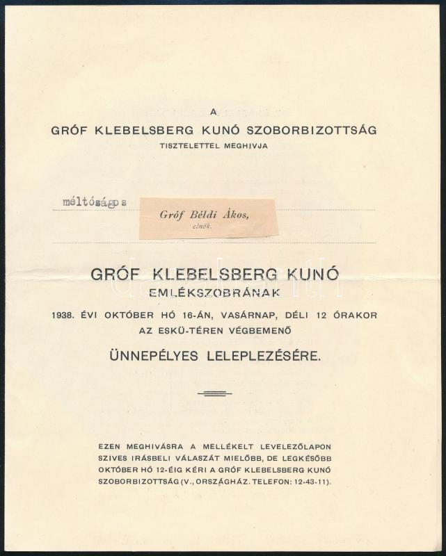 1939 A gróf Klebersberg Kúnó szoborbizottság meghívója a szobor leleplezésére az Eskü téren hozzá az autó szélvédőre ragasztható behajtási engedély, autójegy