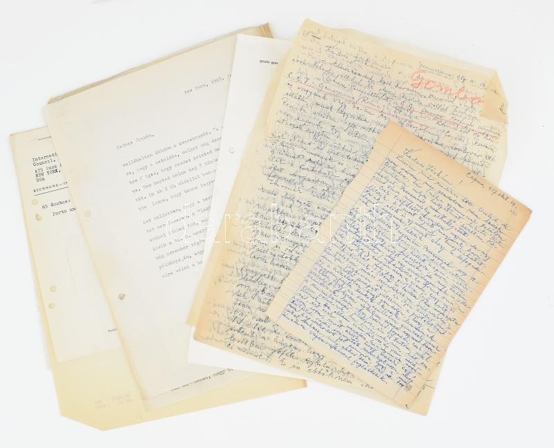 1957 - 1988 Gombos Gyula (1913-2000) Széchenyi-díjas emigráns irodalomtörténész, újságíró, író, esszéíró gépelt, aláírt (2 db), valamint autográf levele (2 db) Molnár József (1918-2009) emigráns magyar író, könyvkiadó, nyomdász, folyóirat szerkesztő, az Aurora Kiadó szerkesztője részére, valamint Molnár József néhány gépelt válaszlevele, számlák...stb. Összesen 8 db. Közte szakadt.