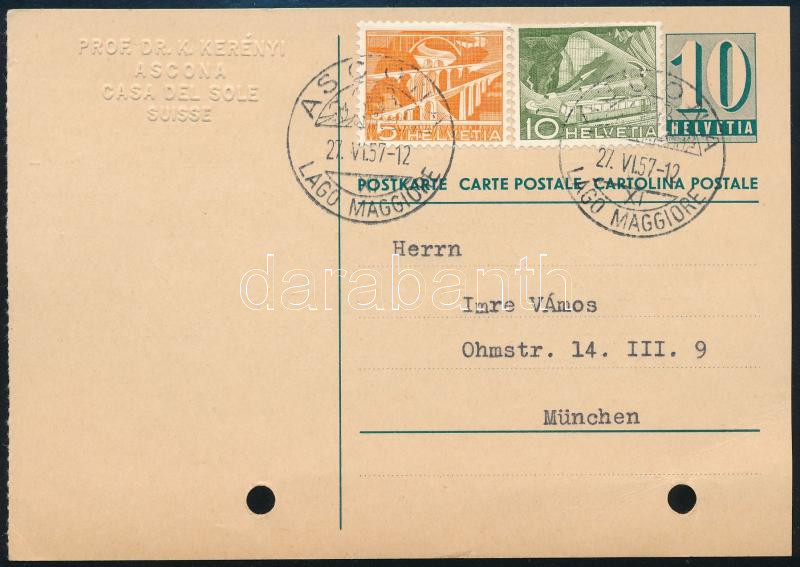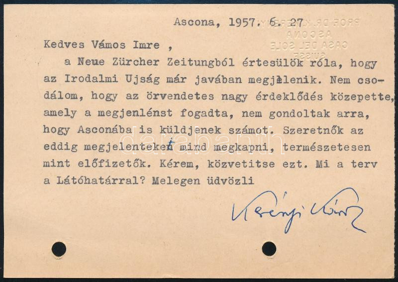 1957 Ascona, Kerényi Károly / Karl Kerényi (1897-1973) klasszika-filológus, vallástörténész, egyetemi tanár gépelt lapja, autográf aláírásával, szárazbélyegzőjével, Vámos Imre (1927-1993) író, újságíró, a Látóhatár szerkesztője részére. Melyben a megjelent Látóhatár számokból kér 1-1 darabot, és megkérdezi: "Mi a terv a Látóhatárral."