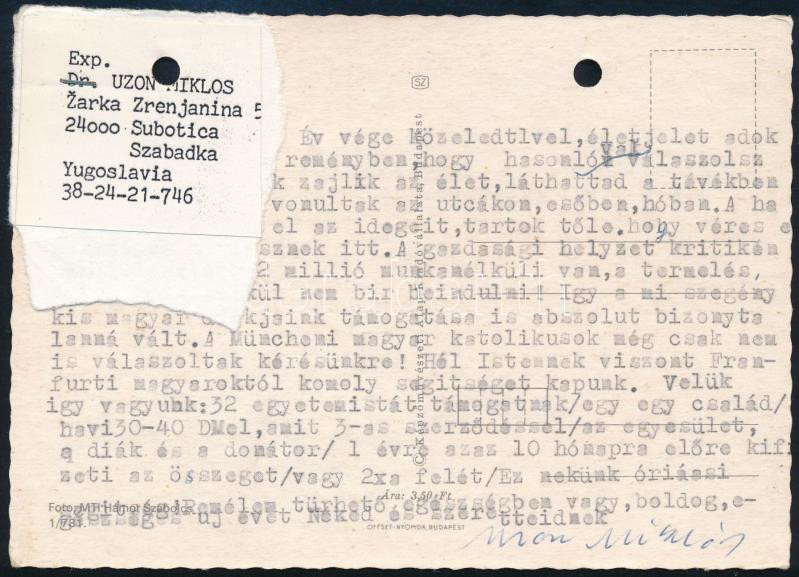 cca 1970-1980? Uzon Miklós (1917-2018) vajdasági magyar ügyvéd, a Kosztolányi Dezső Diáksegélyező Egyesület alapító elnökének gépelt képeslapja, autográf aláírással Molnár József (1918-2009) emigráns magyar író, könyvkiadó, nyomdász, a (Új) Látóhatár folyóirat és az Aurora Kiadó szerkesztője részére