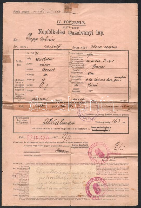 1917 Szikszó, népfölkelési igazolványi lap, javított, hajtott. https://www.darabanth.com/de/489-Fernauktion/489.0/Kunst-Dokumente-andere-Sammelgebiete/Militaria~1000039/1917-Szikszo-nepfolkelesi-igazolvanyi-lap-javitott-hajtott~II3252588