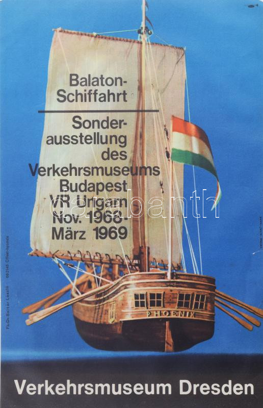 1968 Balaton-Schiffahrt, Sonderausstellung des Verkehrsmuseums Budapest, Verkehrsmuseum Dresden / Balatoni hajózás, a budapesti Közlekedési Múzeum kiállítása Drezdában, német nyelvű kisplakát, villamosplakát, kis lapszéli szakadással, 23,5x16 cm