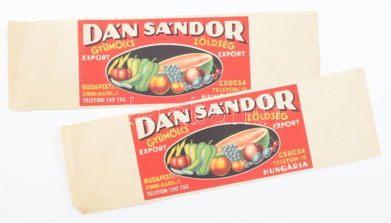 cca 1940 Dán Sándor gyümölcs-zöldség export konzerv címke, 2 db, 31x9 ... https://www.darabanth.com/de/489-Fernauktion/489.0/Kunst-Dokumente-andere-Sammelgebiete/Werbungen~1000005/cca-1940-Dan-Sandor-gyumolcs-zoldseg-export-konzerv-cimke-2-db-31x9-cm~II3181963