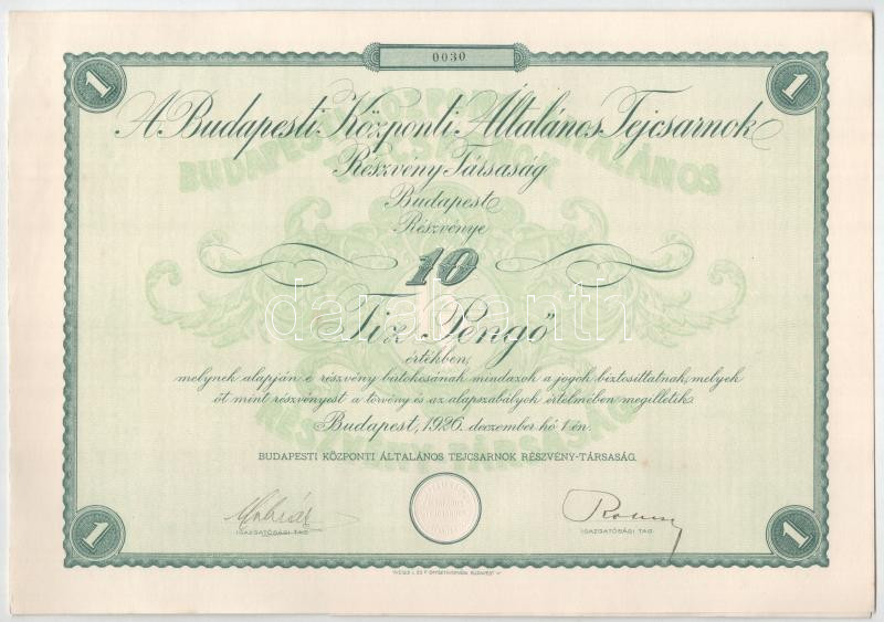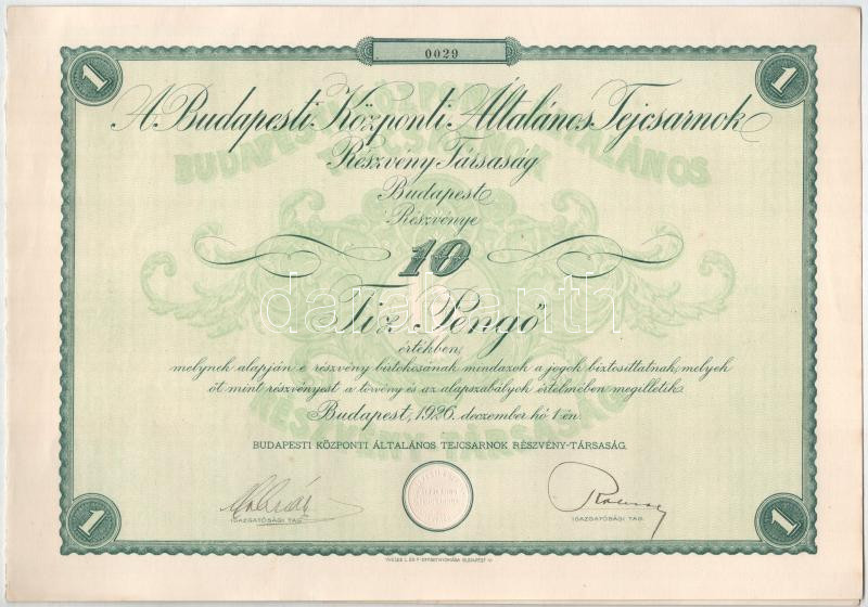 Budapest 1926. "Budapesti Központi Általános Tejcsarnok Részvényt... https://www.darabanth.com/de/489-Fernauktion/489.0/Numismatik/Aktien-und-Tickets~2000006/Budapest-1926-Budapesti-Kozponti-Altalanos-Tejcsarnok-Reszvenytarsasag-reszvenye-10P-ro~II2970671