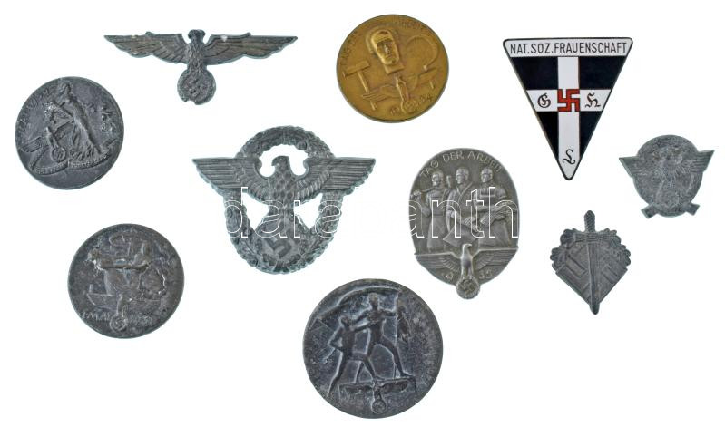 Német Harmadik Birodalom DN(~1930-1940) 10xklf fém katonai jelvény és kitűző tétel, benne DN(~1930) "Nemzetiszocialista Német Munkáspárt" női szervezete zománcozott fém jelvény, hátoldalán "RZM 72" gyártói jelzéssel (~40x45mm), stb. T:vegyes, 3db tű nélkül