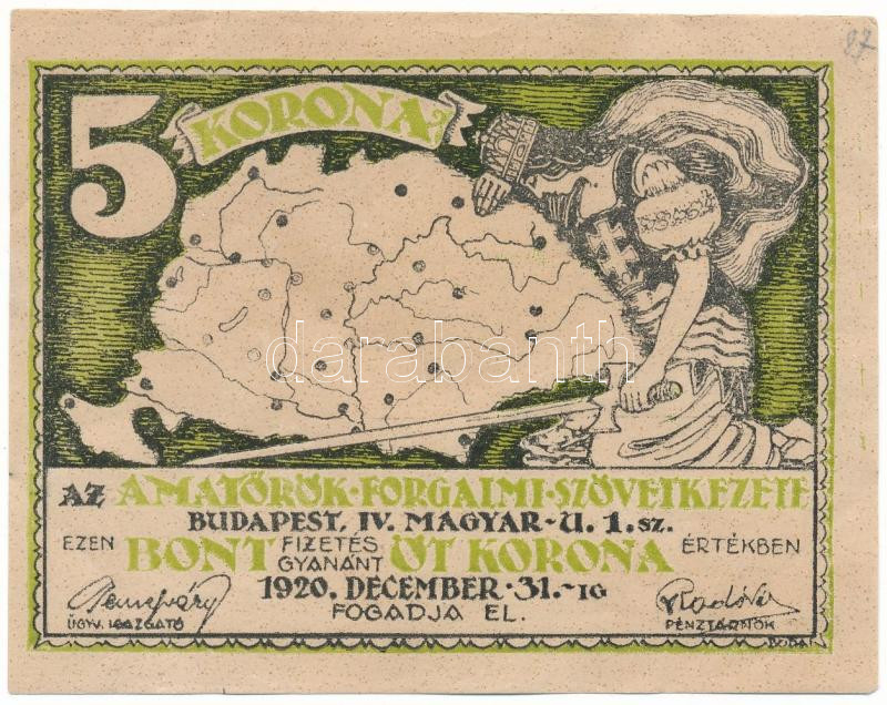 Budapest 1920. 5K "Amatőrök Forgalmi Szövetkezete" T:AU saro... https://www.darabanth.com/de/489-Fernauktion/489.0/Numismatik/Notgeld-aus-Papier-und-Metall~2000007/Budapest-1920-5K-Amatorok-Forgalmi-Szovetkezete-TAU-sarokhajlasok3Cbr-3E-Adamo-BUC-87~II3357068