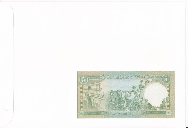 Syria 1988. 5 Pounds in envelope with stamp and cancellation C:UNC