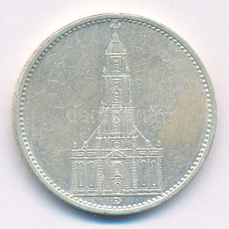 Német Harmadik Birodalom 1934D 5M Ag "Garnisonkirche" T:2,2- kis ph. German Third Reich 1934D 5 Reichsmark Ag "Garnisonkirche" C:XF,VF small edge error Krause KM#83