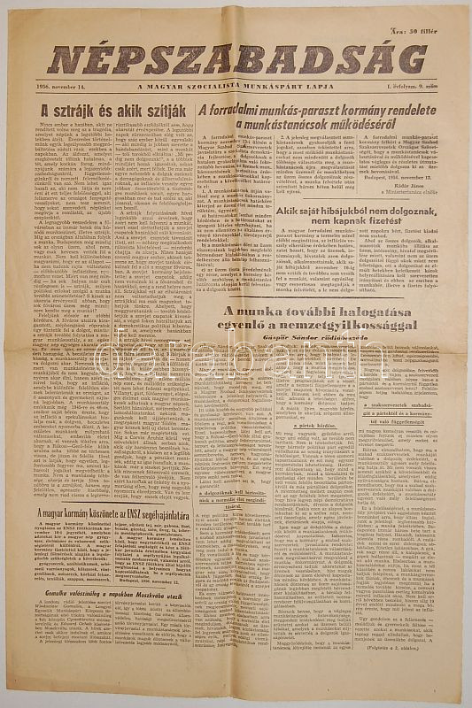 Beschreibung: 1956 november 14. a Népszabadság 9. száma benne: munkástanácsokról szóló rendelet